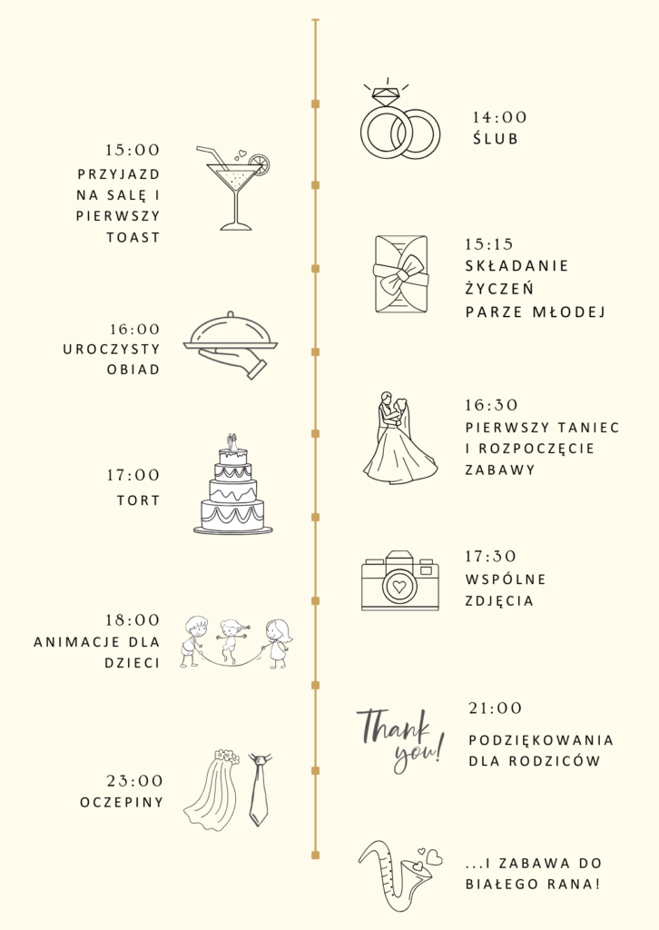 Abyśmy mogli dokładnie zaplanować wszystko i upewnić się, że będziecie mieli wspaniałe wspomnienia, prosimy Was o potwierdzenie przybycia na nasze wesele. Wasza obecność jest dla nas niezmiernie ważna, i cieszymy się na myśl, że będziecie mogli świętować z nami ten wyjątkowy dzień.
